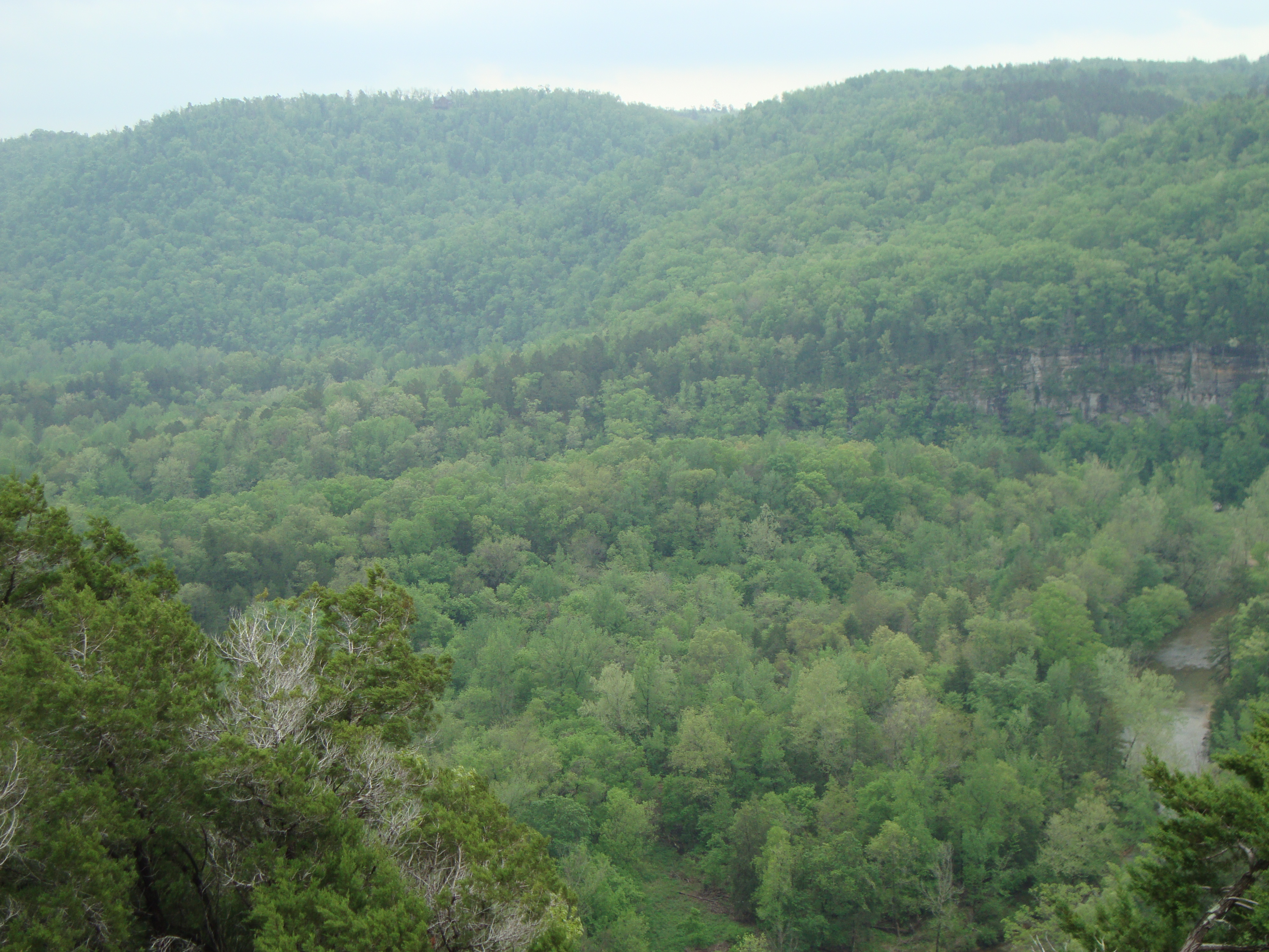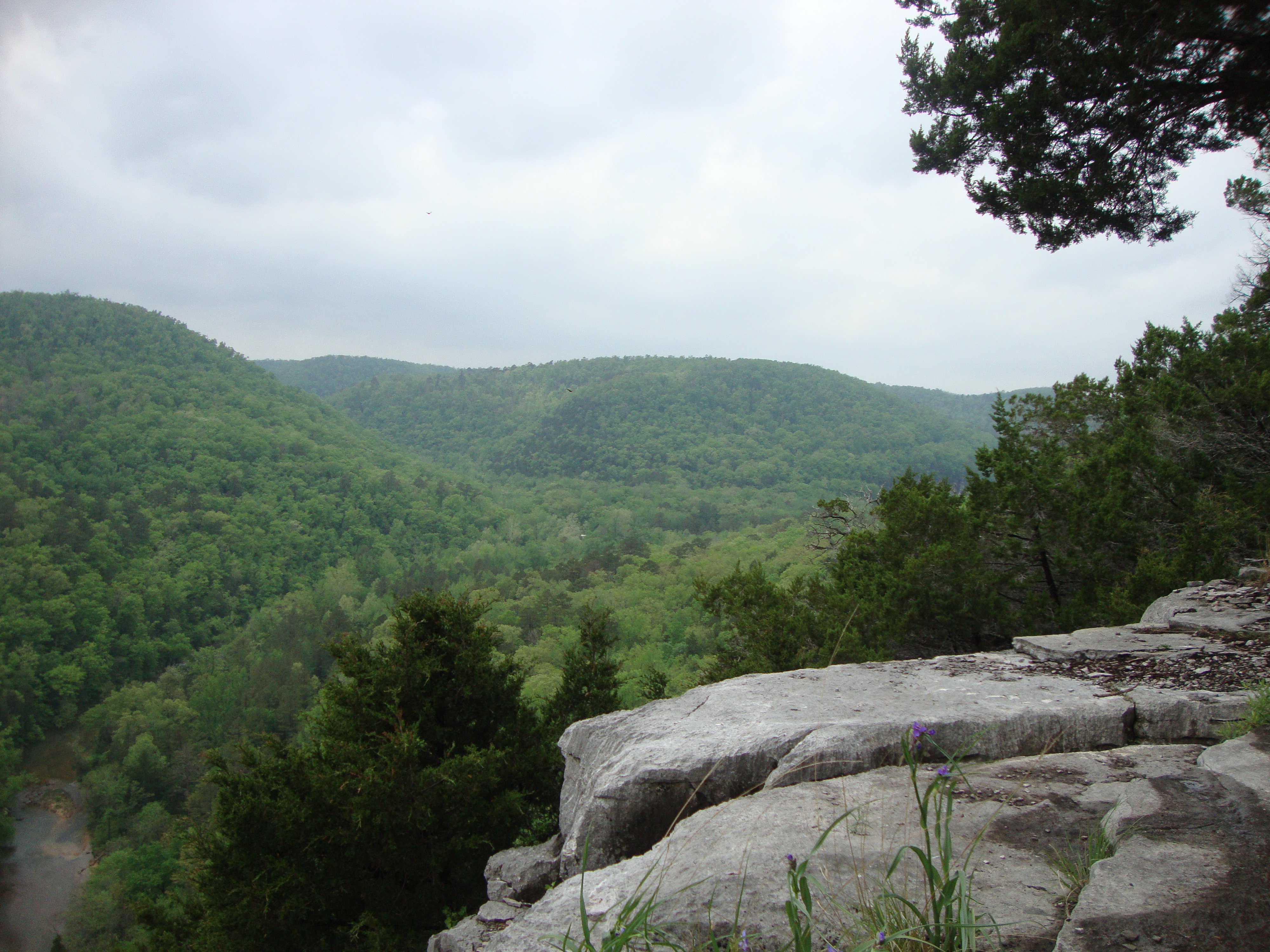 Bad Branch spun around and met up with Jack’s Branch, where I rolled on down and had a good time, until the trail turned “up” and away from the Blanchard Springs Campground. At that precise hard left back up the trail, the work began. Jack’s Branch over to the junction with Scrappy Mountain was a blue collar workday at the foundry. Rocks, slabs of rock, loose stones, boulders and sandy/scree-like wet trail were working on the TKO. I felt Syllamo’s Revenge creeping in, so I stopped, had a few bites of energy food and snapped some photos at a nice view: