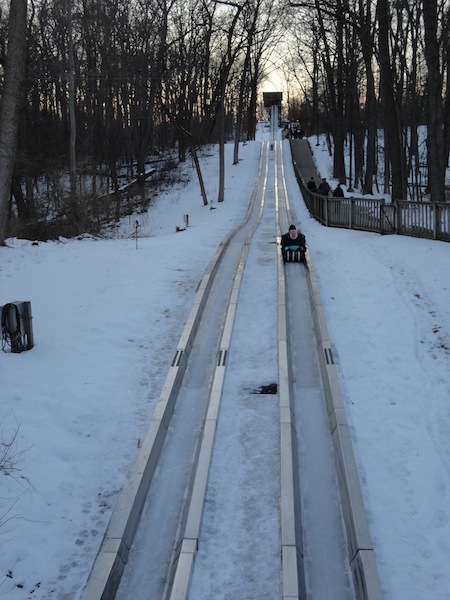 At a quarter mile long and dropping ninety feet, you slide for 20-30 seconds, reaching average speeds in the mid-30s miles per hour. The record speed is 42 mph! It is all smiles and laughter and shouts of exhilaration. If you are ever near Pokagon State Park in northeast Indiana in winter, stop in for some good clean pure fun! There’s also ice skating and xc skiing in the park.